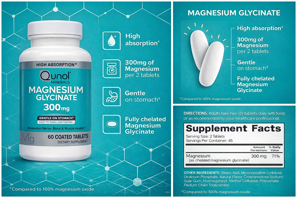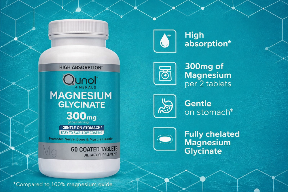 Qunol Magnesium Glycinate 300mg 100% Glycinate Chelated Magnesium Supplement 90ct Tablets